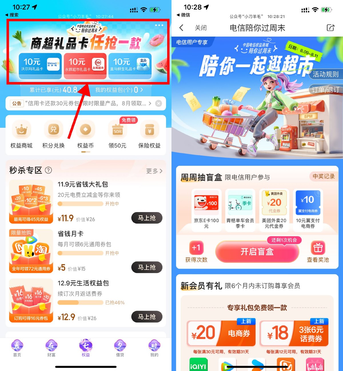翼支付APP底部“权益”->点轮播图进入->分享有1次机会,话费券可在翼支付APP使用,代金券是直发对应APP内得